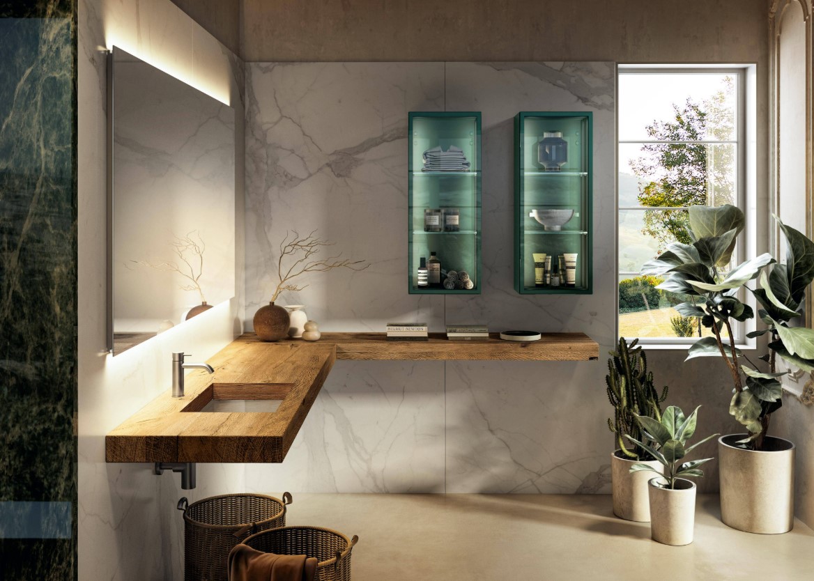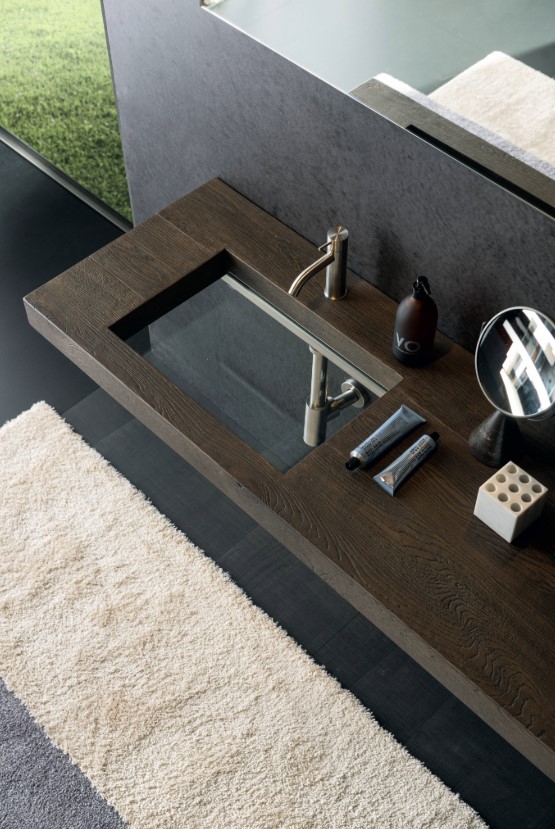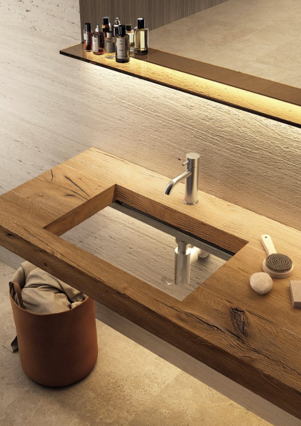 Depth no es solo un lavabo, sino una pieza de diseño pensada para sorprender y diferenciar. Su combinación de madera natural, cristal y geometría innovadora lo convierte en un elemento central dentro del baño, capaz de transformar completamente el espacio.
