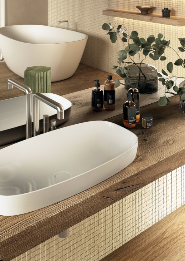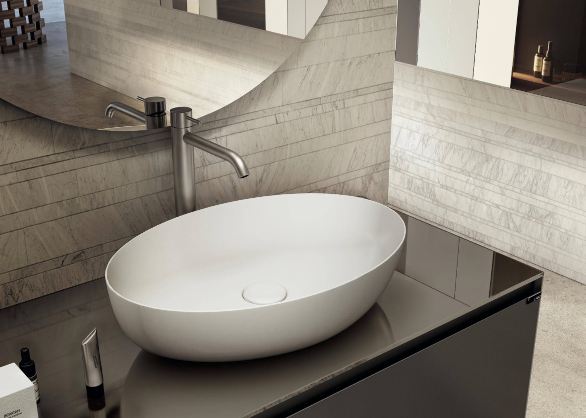 Gracias a su diseño sobre encimera, el lavabo Elyssa ofrece una gran flexibilidad compositiva: