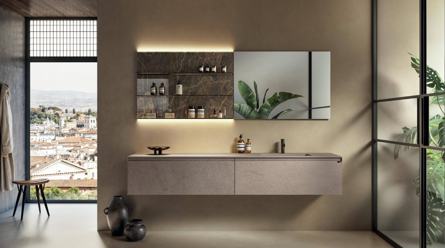 Fabricado en MDi, un material innovador compuesto por minerales naturales, Klif ofrece una excelente resistencia al uso diario, a la humedad y a los productos de limpieza, manteniendo intacta su apariencia con el paso del tiempo. Además, su acabado reproduce la textura y profundidad visual de la piedra natural, aportando una dimensión estética que enriquece el conjunto del baño y lo acerca a un lenguaje más arquitectónico y contemporáneo.