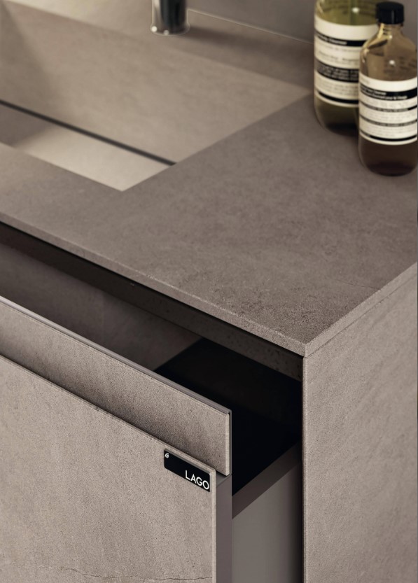 El lavabo Klif está pensado para integrarse en muebles bajos, especialmente dentro de los sistemas modulares de LAGO, lo que permite crear composiciones totalmente personalizadas. Esta integración favorece la continuidad visual entre el lavabo y el mobiliario, generando espacios más ordenados, funcionales y coherentes desde el punto de vista del interiorismo.